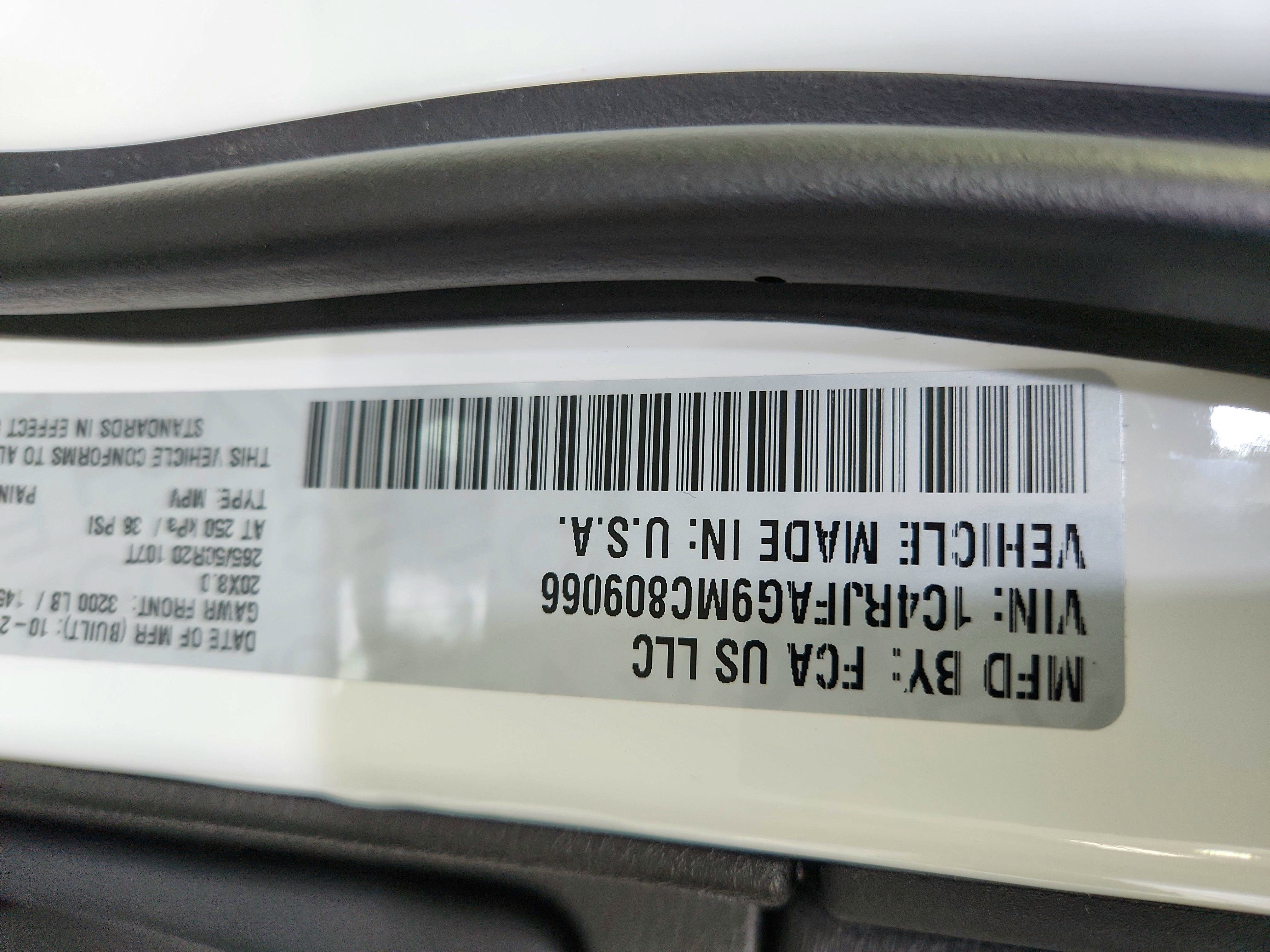 FRONT LICENSE PLATE BRACKET, ENGINE: 3.6L V6 24V VVT UPG I W/ESS (STD), BRIGHT WHITE CLEARCOAT, BLACK, CLOTH BUCKET SEATS (MF), Wheels: 20" x 8.0" Matte Black Aluminum, Valet Function, Trip computer, Transmission: 8-Speed Automatic (850RE), Transmission w/Driver Selectable Mode and Sequential Shift Control, Tracker System.