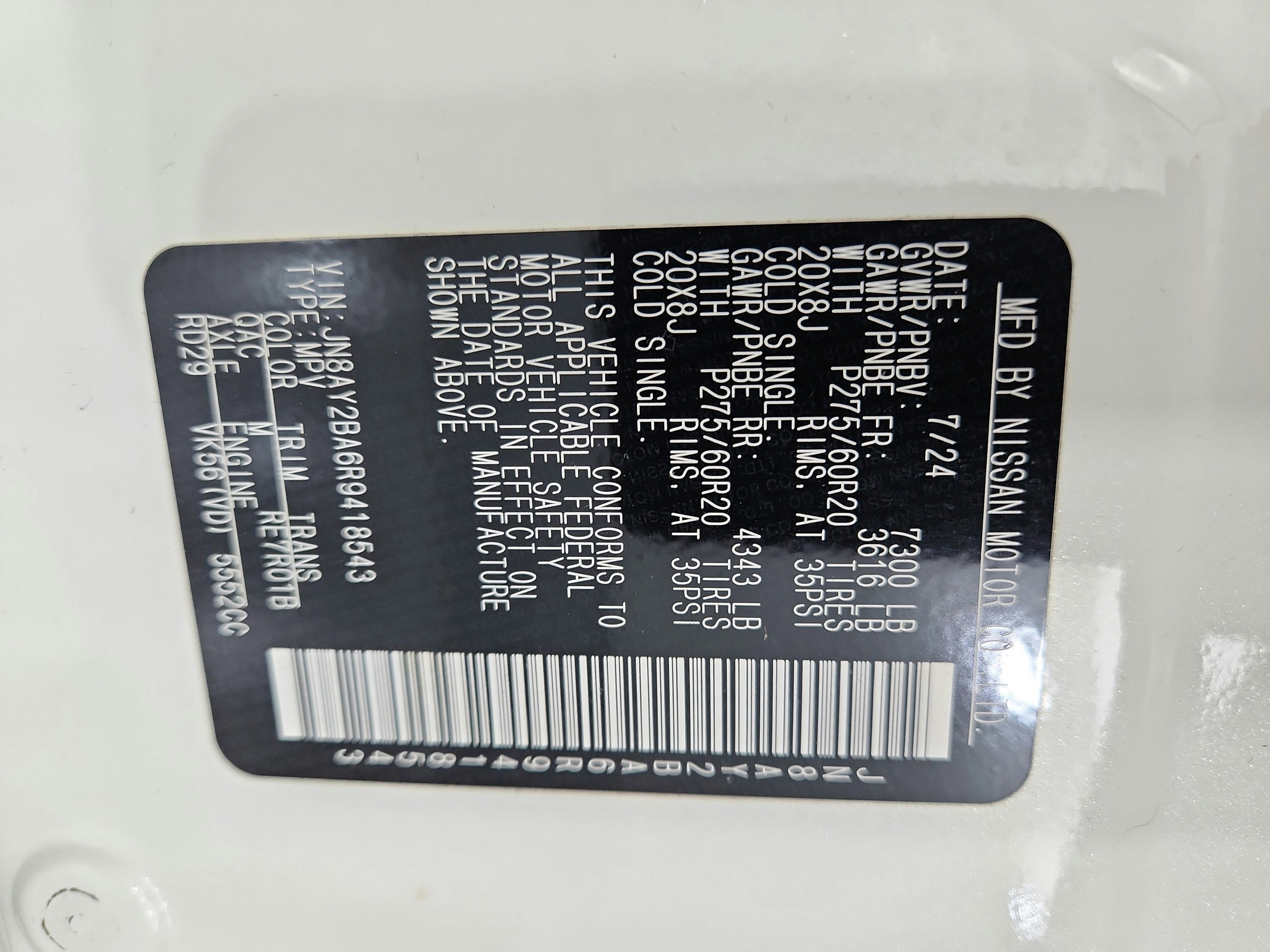 [M92] CARGO PACKAGE -inc: cargo area protector, cargo net and first aid kit , [L93] 3RD ROW CARPETED FLOOR MATS - CAPTAIN SEAT -inc: carpeted cargo mat, [H92] NISSAN USB CHARGING CABLE SET, [B93] ROOF RAIL CROSS BARS - SILVER, Wireless Phone Connectivity, Window Grid Diversity Antenna, Wheels: 20" x 8J Painted Alloy -inc: 18-spoke, Machined finish, Valet Function, Trunk/Hatch Auto-Latch, Trip Computer.